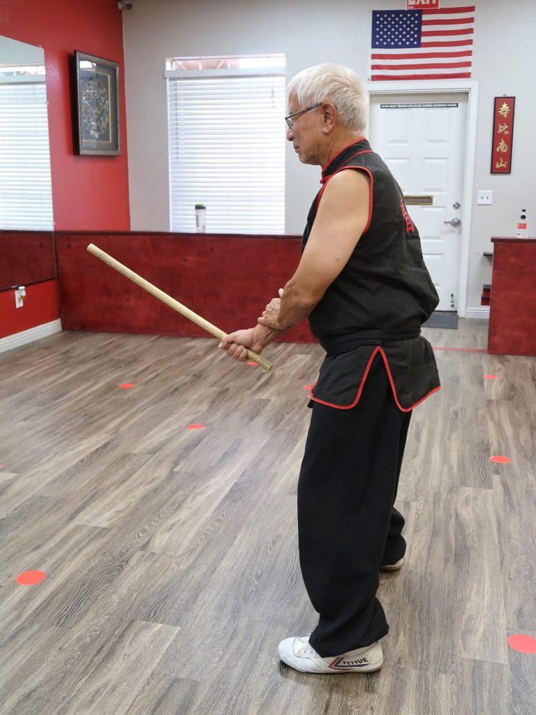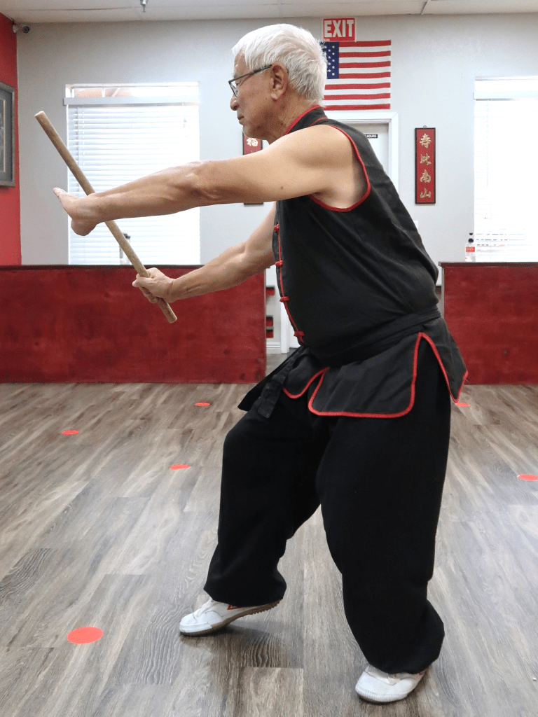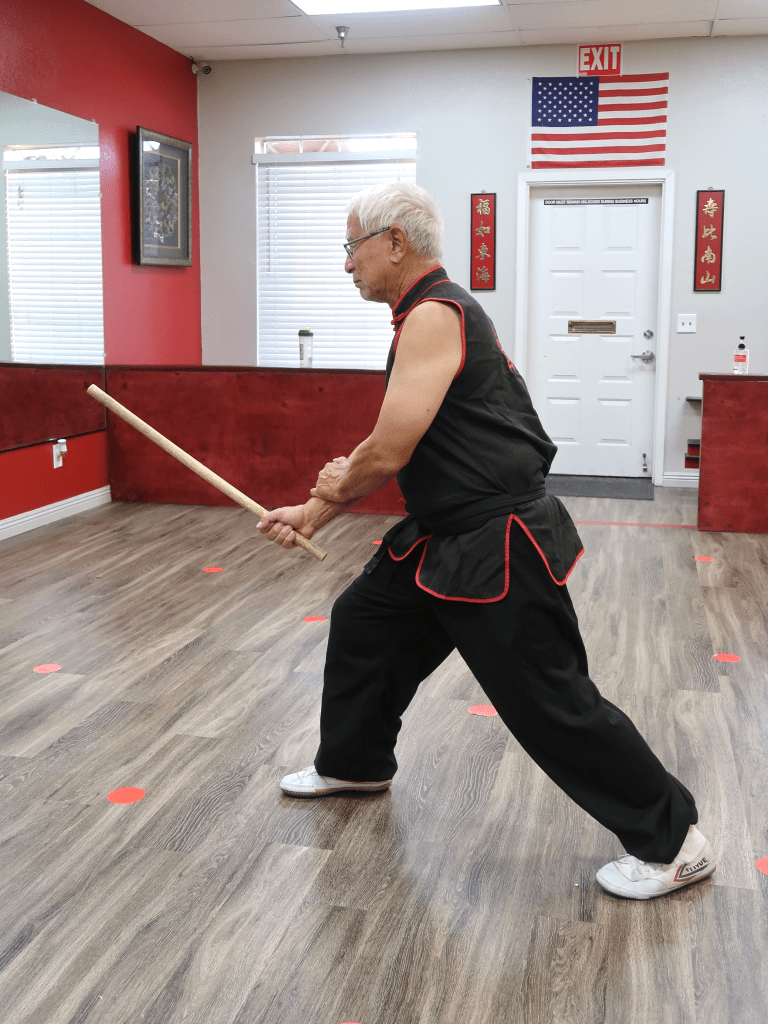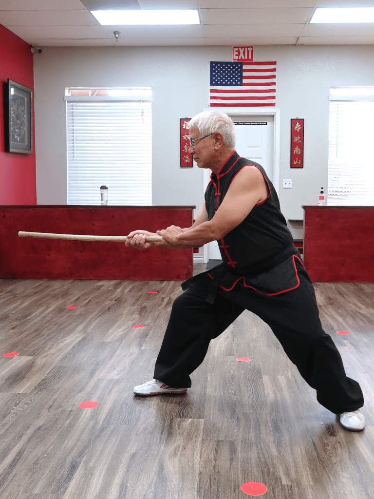 Since my martial arts background is in kung-fu, it was relatively easy to employ some of these stances in the set. Note that the stances are higher than in some traditional forms, but the reasoning for that is greater mobility. Think of the stance in this way: we use the stance to strengthen our posture or position with the stick. Key points with the stances are do you feel strong and balanced, does the stance enhance what you are trying to do, and how do you move in or out of that stance. Try to follow the stance, modify if you need to. The stance is an aid to you, not for some tournament score.