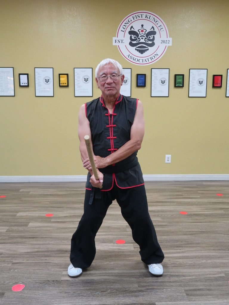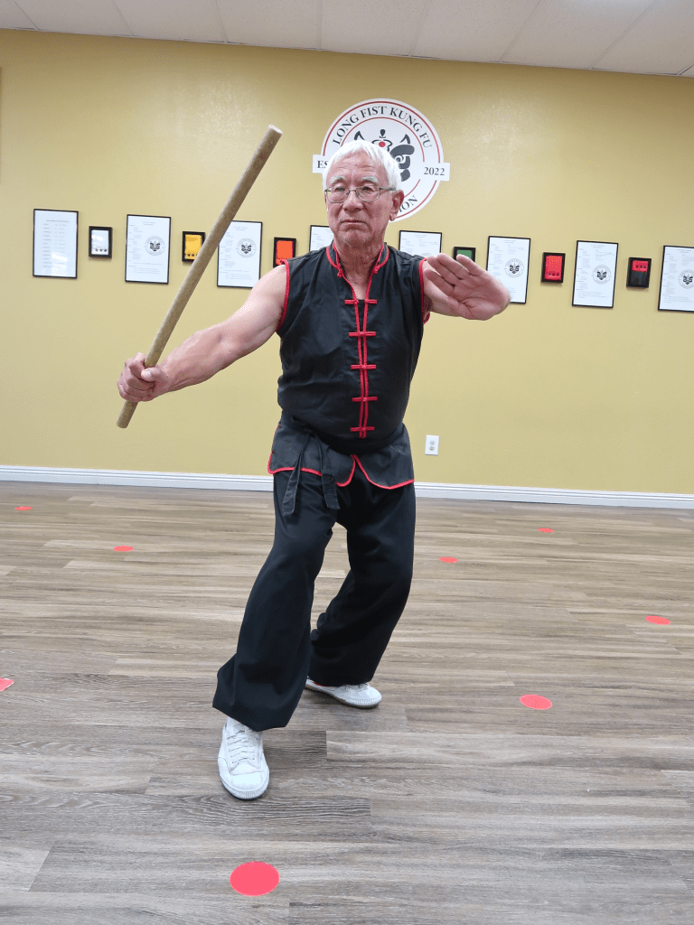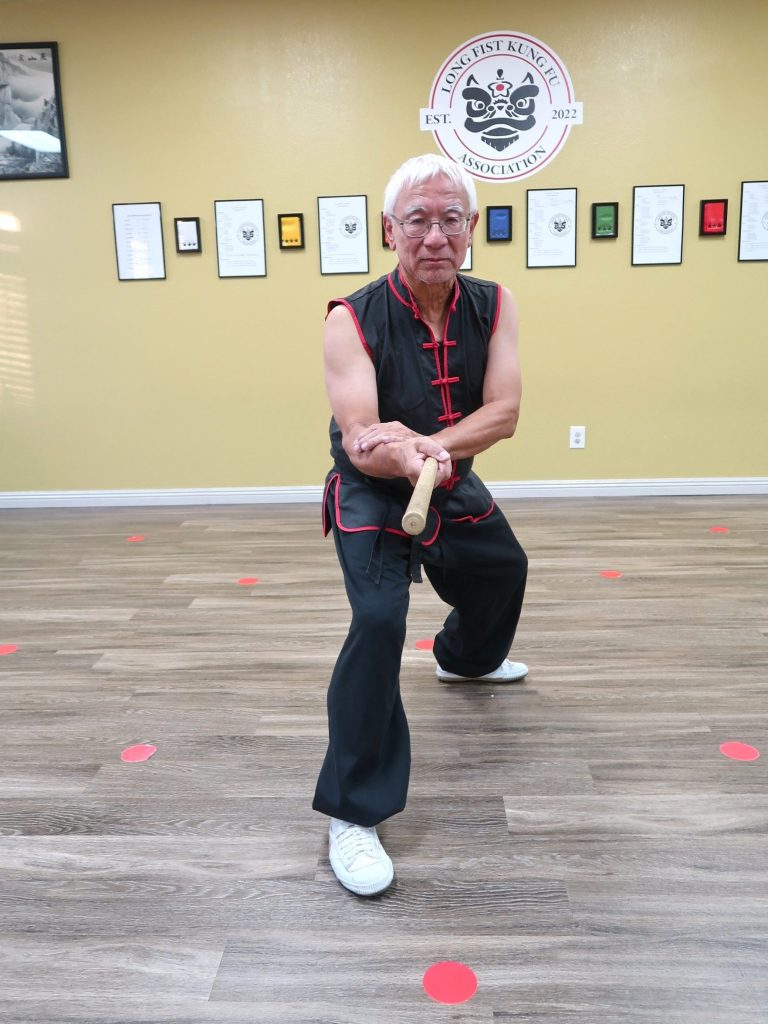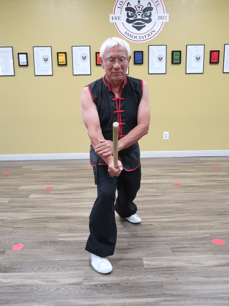 Since my martial arts background is in kung-fu, it was relatively easy to employ some of these stances in the set. Note that the stances are higher than in some traditional forms, but the reasoning for that is greater mobility. Think of the stance in this way: we use the stance to strengthen our posture or position with the stick. Key points with the stances are do you feel strong and balanced, does the stance enhance what you are trying to do, and how do you move in or out of that stance. Try to follow the stance, modify if you need to. The stance is an aid to you, not for some tournament score.